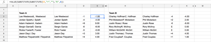 The biggest issue so far is that the scores aren’t adding up. This is because a lot of ESPN’s data is actually text, so math formulas skip right over it. Specifically, we want to get rid of the “+” sign for over-par scores and change even scores from “E” to the number zero.