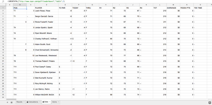 The IMPORTHTML function is what I used here. It might require a little trial-and-error to find a good source, but once you find one it’s an easy way to pull data from another website. In this case the URL I used was ESPN.com’s Masters leaderboard. You also need to know whether you want to pull data from a table or list on the page. In this case it’s a table. Lastly, you need a numeric reference to the table or list you want to pull from (don’t overthink this one; it’s just a number, which you can guess).