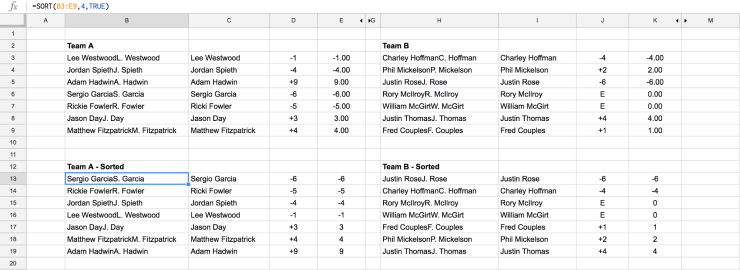 The SORT function creates a copy of the designated range/table (e.g. B3:E9 for Team A) and sorts it by whichever column you indicate (e.g. 4 for the numeric scores in column E). TRUE tells it to sort in ascending order, from lowest to highest (which in golf is best to worst).