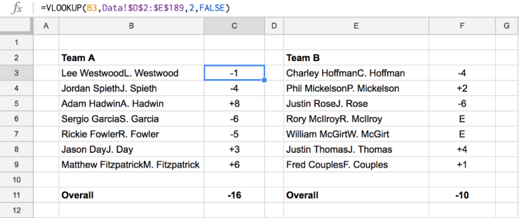 Notice we’re only showing the normal player names in our Results tab, and the “+” signs and “E”s have reappeared. That’s because the calculations have already been made in another tab, so we’re free to show scores in text format here.